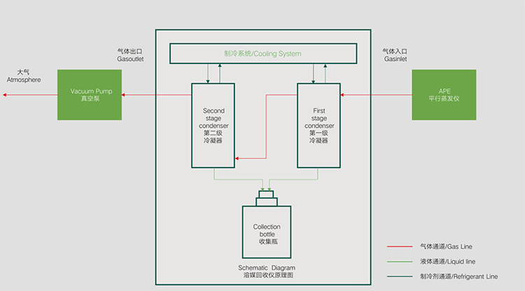 “干式”低温冷凝——溶剂回收更高效 APE 系列不仅可以选择传统的冷却循环水机搭配玻璃冷凝器对溶剂蒸汽进行冷凝回收,还可以选配 eSR220S 溶媒回收仪对溶剂蒸汽进行高效冷凝回收,溶媒回收仪采用“干式”低温冷凝技术,无需使用冷却循环液,-20℃低温下对溶剂蒸汽直接进行冷凝,特别适合低沸点溶剂高效冷凝收集。