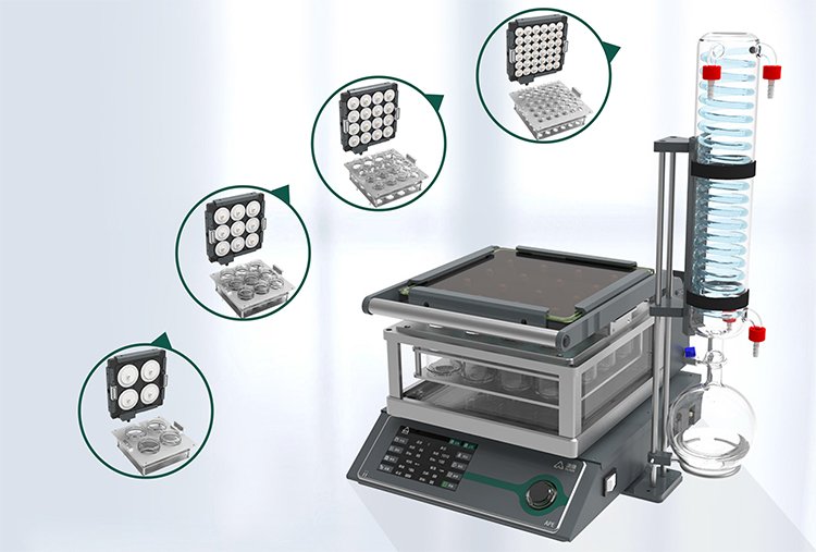 模块化设计——兼容多种容积样品瓶 APE 系列真空平行浓缩仪采用模块化设计,可以选配 850ml、 05450ml、250ml、60ml 样品瓶适配器,满足不同体积样品浓缩需求。
